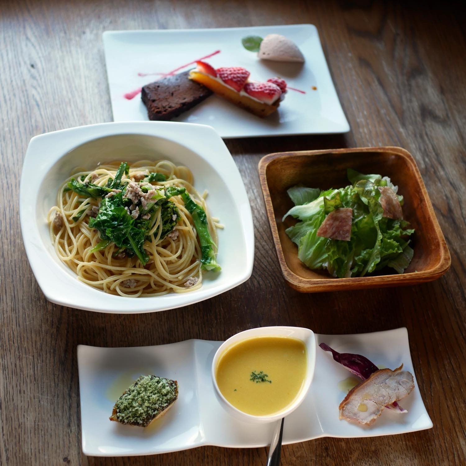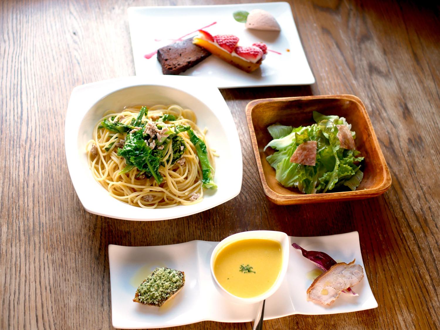 Cランチは、前菜3品盛り合わせ、小さなサラダ、本日のパスタorピッツァにデザート3品盛り合わせと盛りだくさん。