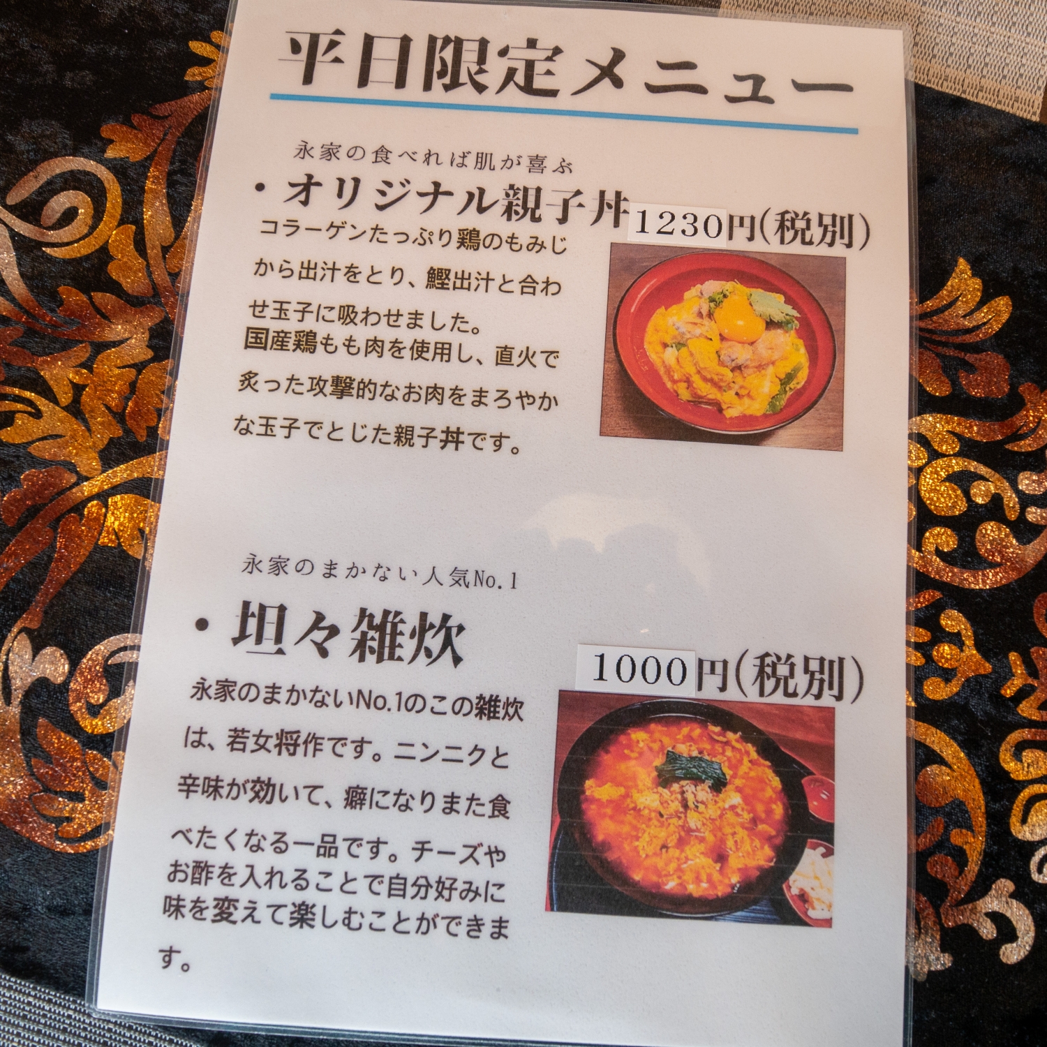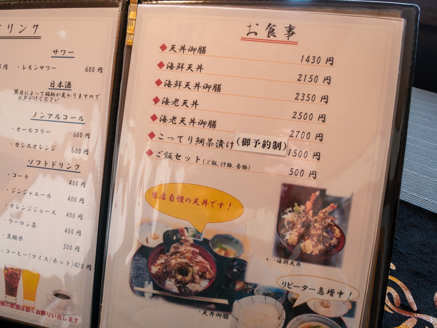 週末は天丼一色、観光客にも人気ですが、平日にしか食べられない限定メニューがどれも本当に美味しそうなのが印象的でした。メニューにあった【こってり鯛茶漬け】は予約制とのことで、今回は残念ながら食べる事ができず。気になった方はぜひご予約を。