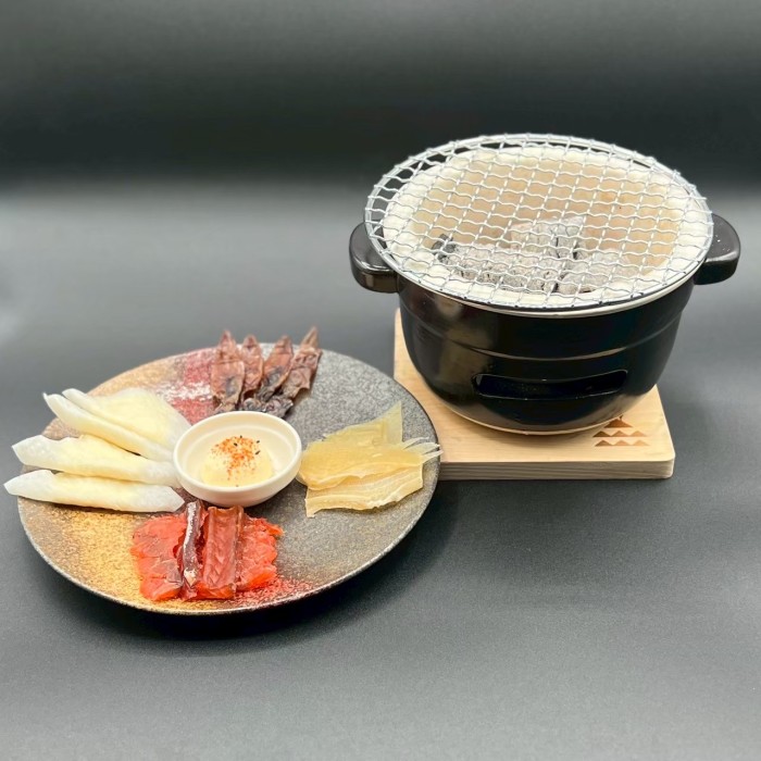 エイヒレやホタルイカの素干しなど、まさしく酒のアテになる4種を炭火七輪の上に乗せて、ご自分で少しずつ炙って召し上がっていただきます。 チビチビと酒を楽しむ「呑べえ」のための商品です。