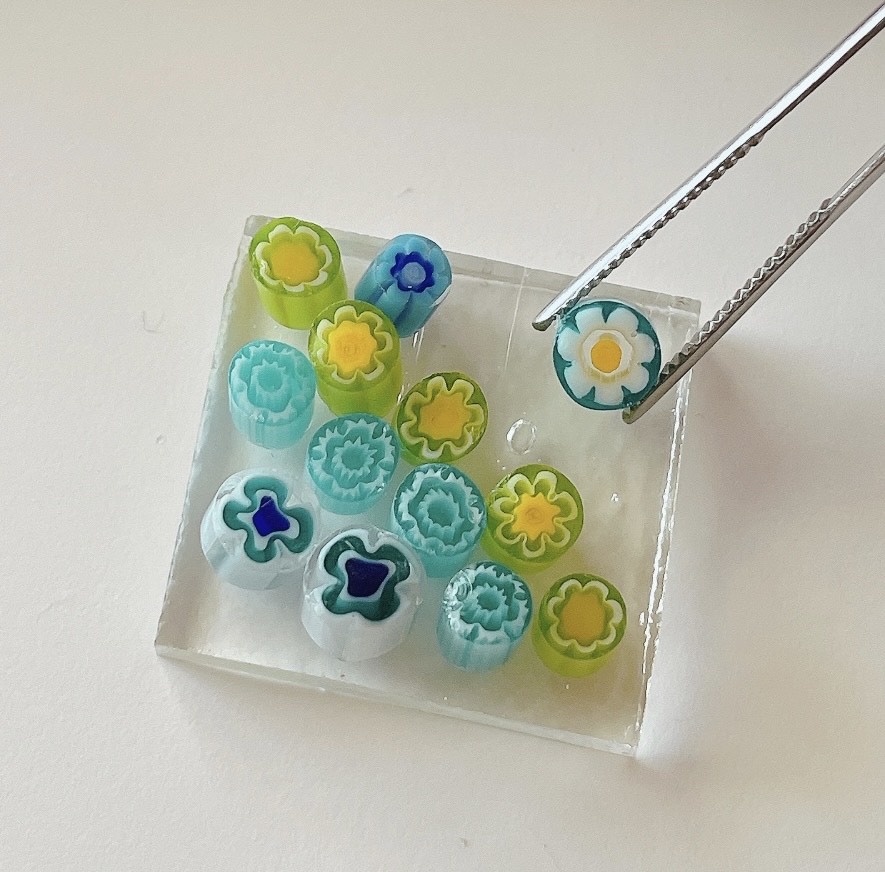予めアクセサリー用にカットしたガラスから好きな形を選び、「ミッレフィオーリ」というガラス棒をカットしたものを並べて接着剤でとめます。その後、専用の電気炉で750℃で焼成し(これをガラスヒュージング技法といいます)、アクセサリーにお仕立てしてお渡しします。
