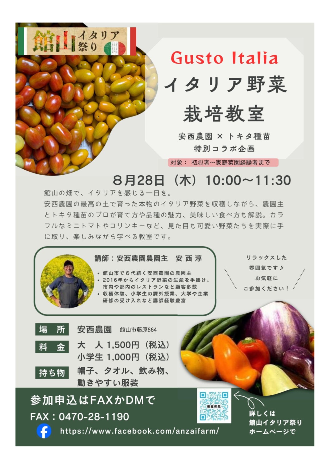 館山の最高な環境で育った本物のイタリア野菜を収穫しながら、農園主とトキタ種苗のプロが育て方や品種の魅力、美味しい食べ方も解説。カラフルなミニパプリカ、イタリアなすやミニトマトなど、見た目も可愛い野菜たちを実際に手に取り、楽しみながら学べる教室です。