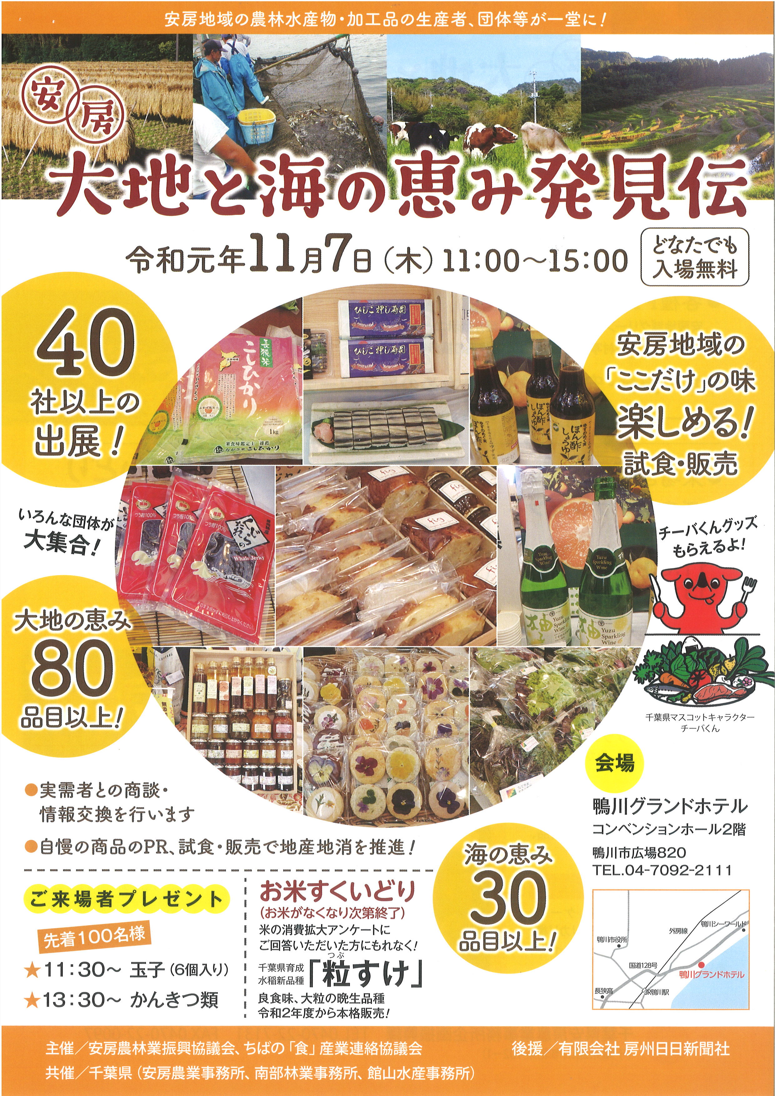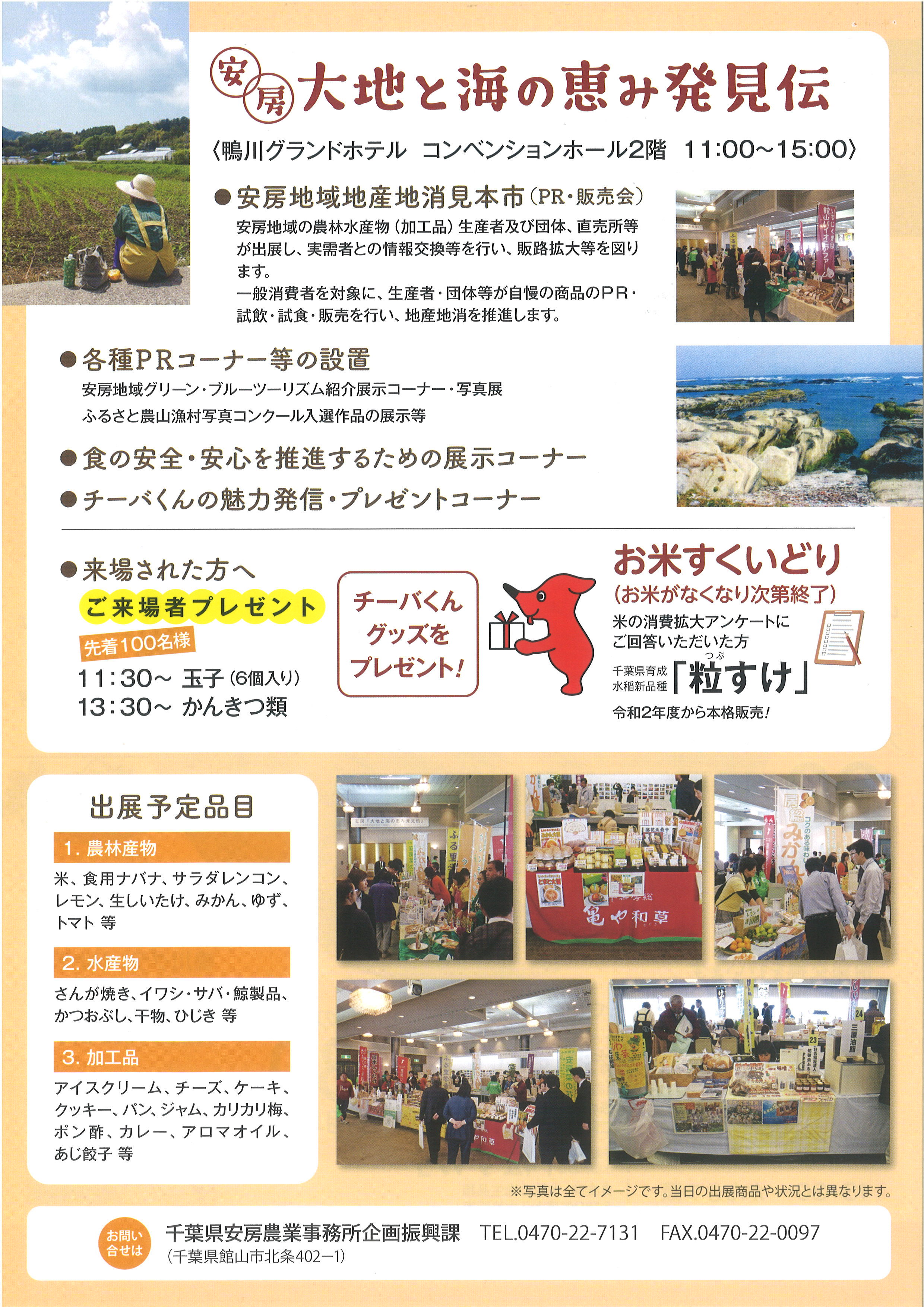安房農林業振興協議会等では、安房地域の農林水産物・加工品の生産者、団体が一堂に会する「安房 大地と海の発見伝」を開催します。自慢の商品のPR、試食・販売で地産地消を推進します!