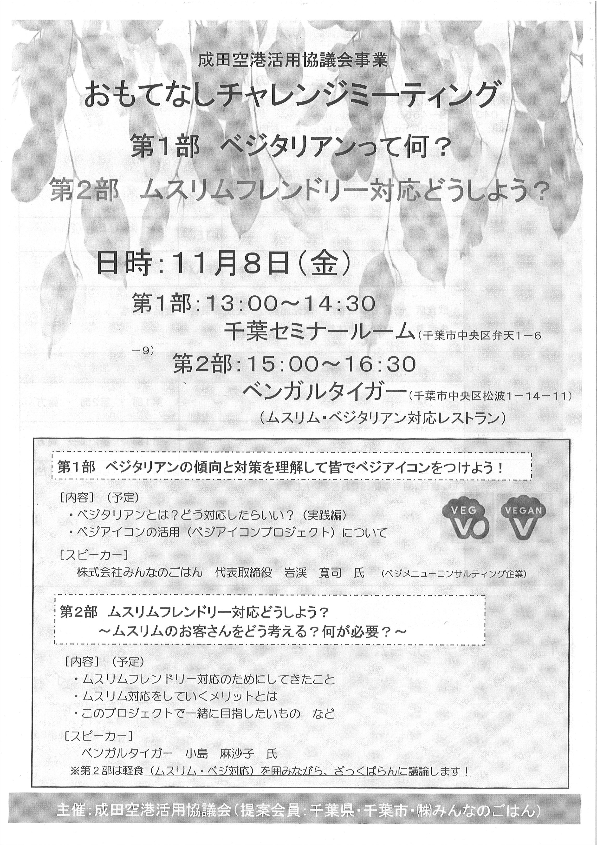 成田空港活用協議会では、「訪日客等への”おもてなし”食プロジェクト」を推進するため、事業者の方を対象として、ベジタリアン・ムスリム対応に「実際どう取り組めばいいのか」「採算の面・オペレーションの面」などをざっくばらんに話す検討会を開催します。